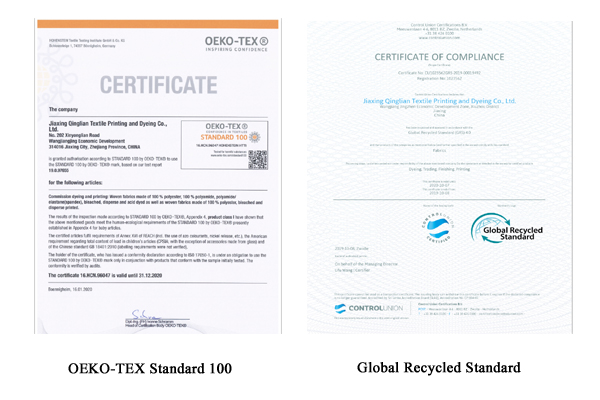 嘉兴市庆联纺织印染股份有限公司前身是嘉兴市新永联纺织整理有限公司,位于嘉兴市王江泾开发区新永联路202号,占地100亩,厂房5万平方米,目前员工800人左右。公司先后通过ISO9001质量管理体系,ISO14001环境管理体系,国际生态纺织品OEKO-TEX Standard 100体系认证以及全球回收标准GRS认证。拥有从韩国、意大利、台湾等地引进的定型机、溢流染色机、高温高压卷染机、气流染色机、OS精炼机、成品检验机等一系列先进的染整设备150多台/套, 采用国际先进生产工艺,染色生产全过程采用电脑控制系统,加工各类合纤,天然纤维及交织物的染整,日生产能力50万米。公司技术力量雄厚,聚集了一大批染整行业的精英技术人员,一线操作人员全部录用具有多年操作经验的技术工人,确保产品质量。大门幅可达2米。